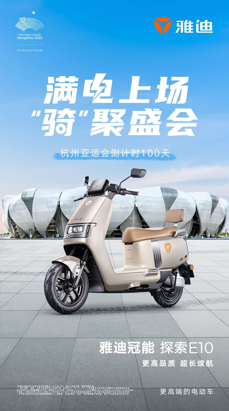 随着杭州亚运会进入100天倒计时,期待已久的亚运盛会即将揭开序幕。作为两轮电动行业代表的雅迪,又将在杭州亚运会的“赛场”上展现怎样的中国品牌魅力,带来何等亮眼的中国智造精彩?一同期待吧!